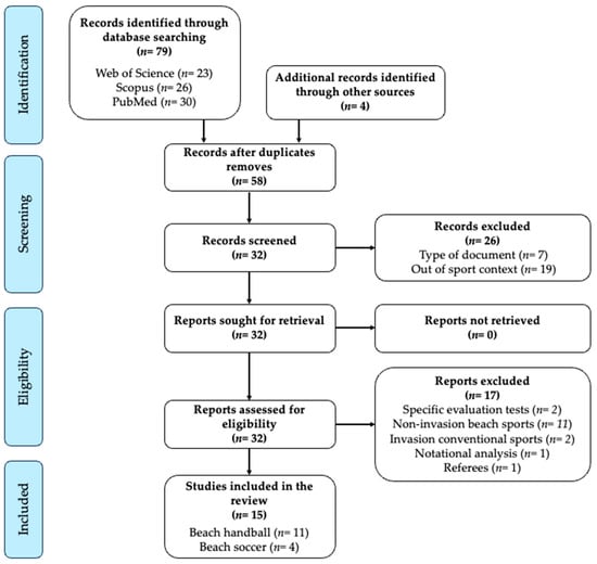 Seventy-nine studies were identified from the database search on Web of Science (n = 23), Scopus (n = 26), and PubMed (n = 30). In addition, four additional studies were identified through the list of references and other sources, being a total of 83 articles. The Zotero reference manager software (version 6, Corporation for Digital Scholarship, Vienna, VI, USA) was used to import and eliminate any duplicates (25 studies). Then, 26 records were excluded from screening due to the type of document (four books or book chapters, one patent, and two conference papers) and being out of the sport context (n = 19). From the remaining 32 studies, 12 did not fulfill the inclusion criteria after the revision of the full text due to: (a) specific evaluation tests (n = 2), (b) match or training demands in non-invasion beach sports (n = 11), (c) match or training demands in conventional sports (n= 2), (d) the notational analysis of matches (n = 1), and (e) referees (n = 1). Finally, 15 studies that evaluate the internal and external workload in beach invasion sports were included in this systematic review: (a) beach handball (n = 10) [15,19,27,28,29,30,31,32,33,34,35] and (b) beach soccer (n = 4) [14,21,36,37]. None of the studies assessed beach rugby. A detailed representation of the selection process is illustrated in the flow diagram depicted in Figure 1.