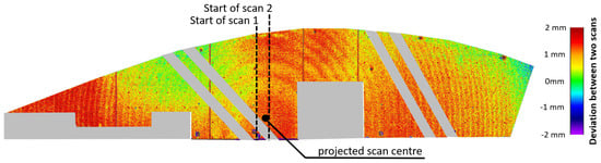 Deviations of two scans performed from different set-up locations of the Bonn reference wall, with the TU Graz RTC360, as part of the Collector Project (inhomogeneous areas are colored gray).