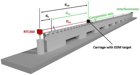 In Figure 3, a schematic setup of our RTC360 tests is depicted. The RTC360 carries out a panorama scan and uses it to measure the distances to an EDM target plate on a remotely controlled carriage. The initial distance to the EDM target, relative to the scanning center, , is determined with a calibrated total station (Section 4.3). The carriage’s position along the comparator bench is measured using an interferometer (Section 4.3). Both distances together provide the “true” distance , which will be compared to the RTC360 distance . The distance deviation is computed as follows: