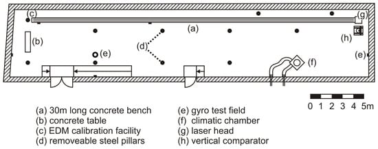 Figure 4 shows a schematic layout of the geodetic metrology laboratory (GML) at the Graz University of Technology. It is located on the ground floor of a university building with a foundation that is separated from the foundation of the building. This is an important fact, as the foundation (and everything connected to it) is not influenced by temperature-, wind-, or traffic-induced movements of the building. The laboratory has a size of 33.2 × 6.3 × 3.5 m3, has no windows (no daylight), and is climate-controlled (temperature: 20.0 ± 0.5 °C, humidity: 50 ± 10% r.H.), and thus, it provides the stable conditions that are needed for instrument testing.