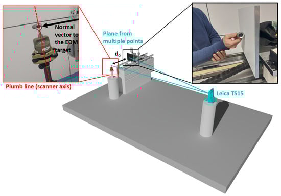 This implies that the scanner has to be set up vertically, which was realized by adjusting the tribrach that is attached to the instrument-holding pillar of the horizontal comparator. Here, the electronic compensator of the TS15 was used. The frontside of the EDM target was measured with a sphere-mounted retro-reflector with a 38.00 mm diameter and an eccentricity of about 0.1 mm; see Figure 6. On the EDM target plate, several points were measured to estimate a plane and compute the orthogonal distance () between this EDM target plane and the horizontal scanner center.