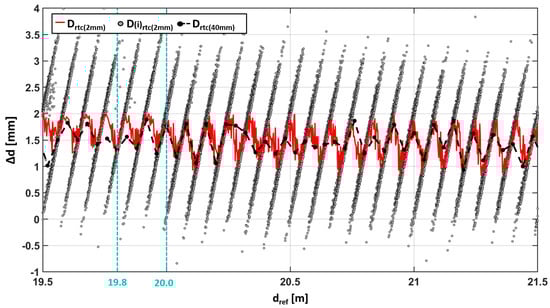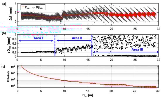 On the horizontal comparator, low-resolution (12 mm @ 10 m) scans on Avery 501 white foil were carried out with a spacing of 40 mm along the comparator bench. Figure 8a shows the distance deviations of all individual scanner measurements () (within the 15 × 15 cm2 subsample) as gray points. The deviations (Equation (2)) of the scanner distance () to the reference distance are shown as a red line. In Figure 8b, the standard deviation of the distance residuals of the plane estimation can be seen. Figure 8c shows the corresponding number of contributing points to the plane estimation.
