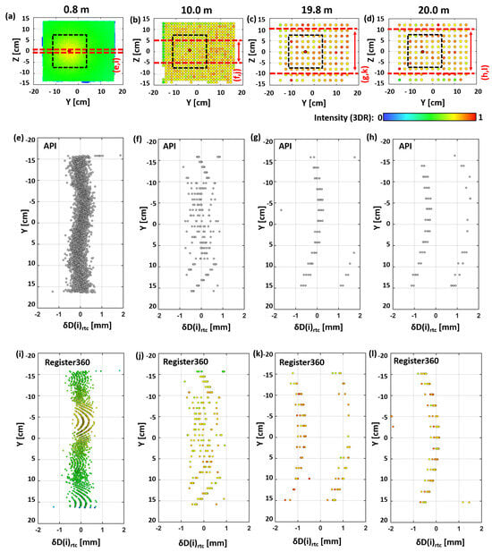(a–d) Intensity-color-coded front view of the whole EDM target plate at four distances of different behaviors, (e–h) corresponding distance deviations of the API-processed point clouds (ground view), and (i–l) the intensity-color-coded distance deviations of the same Register360-processed point clouds.
