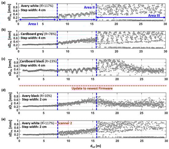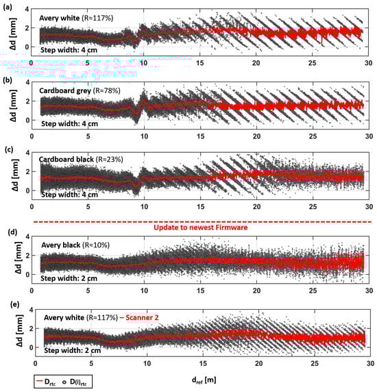 This can be seen in the aforementioned isolated pattern (at about 10 m), which is observed in Figure 11a–c, but is with the Avery black target in Figure 11d. Although a correlation with the material change would be obvious, here, this change is more likely related to a forced firmware update (upgrade from 6.01.131 to 6.03.191) before the measurements of Avery black were carried out. Afterward, the TU Graz scanner was unavailable for further investigations due to repair work. Thus, for Avery white, the measurements were repeated with a second RTC360 scanner also on the newest firmware level (6.03.191), as shown in Figure 11e. The results are almost the same as those seen for the TU Graz scanner (with the lower firmware level) in Figure 11e. However, except for the artefact at 10 m, which is also missing with the same firmware level now, it can be assumed that this artefact (in the millimeter range) was removed with the firmware update. This is an issue that has to be taken into account for precise tasks (e.g., monitoring applications).
