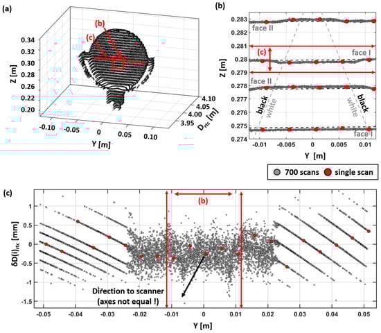 Figure 13a shows a 3D view of the target with the overlaid 700 scans. A distinct pattern with horizontal lines became visible. The vertical spacing reveals the fact that the scanner measurements are triggered by the rotating mirror and, thus, are almost at the same vertical angle in each scan. The observed spacing of approximately 5 mm at a distance of 4 m corresponds well to the chosen measurement mode (12 mm @ 10 m). Contrarily, the horizontal spacings show a more stochastic pattern with the points being much closer to each other, forming visible horizontal lines. This indicates that the vertical scanning lines of individual scans are not directly reproducible. The scanner’s horizontal starting point slightly changes from set-up to set-up. However, horizontal angle readings of the RTC360 were carried out (like in a total station) using angle encoders. The orientation of the internal coordinate system was fixed by its graduated circle, and thus, the geometric relation between the measured points of different scans was preserved. The variation in the vertical scanning lines is a direct result of the limited positioning accuracy of the scanner.