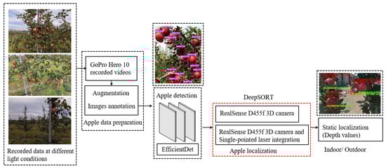 The distance between the 3D camera and the single-point laser was 20 cm in height and 5 cm in the lateral direction between the laser and monocular camera. Compared to other D400 cameras, the RealSense D455f 3D camera was upgraded with a 750 nm near-infrared (NIR) filter, which improved the depth measurements by avoiding false detections caused by light leakage. The key concept of the integrated sensor system was to move the single-point laser ranger to the center of the detected apples, and the moving sequence was arranged based on the detection ID generated by the DeepSORT algorithm implemented in our previous study (Figure 4).