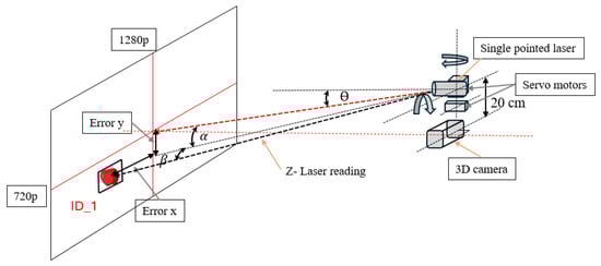 where or y are the center coordinates of a detected apple, or is the lower value of frame size (720), or is the minimum frame resolution (1280), and are the maximum servo angles, and and are the minimum servo angles, respectively. In the camera frame indicated in Figure 5, the servo motors were calibrated based on pixel values. The horizontal moving servo motor (Servo_) covered 1280 pixels by moving 60° degrees to 160° from left to right. The vertical servo (Servo_) covered 720 pixels by moving 70° to 125° degrees. The single-point laser was 20 cm above the 3D camera and the laser point was directed to the middle of the camera frame at the beginning (Figure 6). The vertical servo moved θ (15° degrees) downward to align with the canter position of the camera frame.