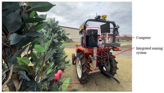 The integrated sensor system was mounted on a four-wheel tractor, and the outdoor conditions were evaluated. The system was evaluated at a static condition; when obtaining the localization coordinates, the vision system was not moved, and after obtaining the localization coordinates from one tree, the tractor was moved to another tree parallel to the tree raw for obtaining the coordinates of the next tree. The spindle orchard architecture was arranged based on artificial trees. The integrated sensor system was kept 75 cm away from the artificial tree row, assuming that the 75 cm distance from the tree canopy could be easily accessible for robotic manipulators for apple harvesting (Figure 7).