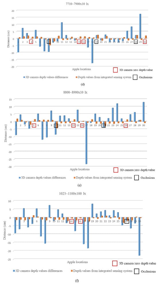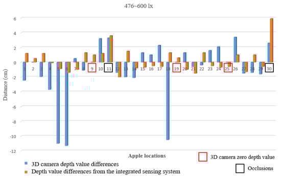 According to the results, the integrated sensor system showed a minimum and maximum error of ±2 cm, except for the values for occluded apples, which is applicable for accurate robotic apple harvesting applications under outdoor conditions. Compared with the RMSE values under different light conditions, the 3D camera RMSE values increased with increasing light intensity (Table 2).