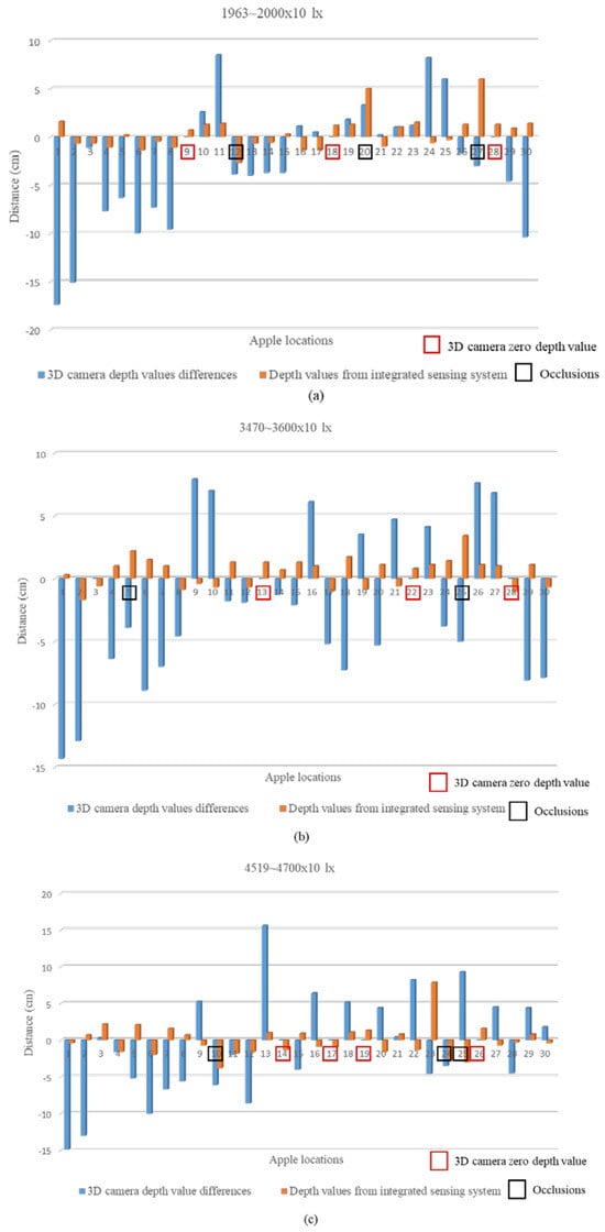 An outdoor experiment was conducted under different light conditions to analyze the developed integrated sensor system to obtain more precise depth values for robotic applications. The experiment was conducted at different times that also included variable cloud conditions and variations in lighting in the morning and afternoon. The light values were measured using a digital light meter (SMART SENSOR, Digital lux meter AS803, accuracy ±5% rdg ± 10, measurement range 1~200,000 lux, Wanchuang Electronic Prod. Co., Ltd., Dongguan, China), and the outdoor data were collected under light conditions of 1963~2000 × 10 lx, 3470~3600 × 10 lx, 4519~4700 × 10 lx, 7710~7900 × 10 lx, 8800~8900 × 10 lx, and 1023~1100 × 100 lx. For each light condition, 30 apple locations were used to obtain the distance information, which was compared with the 3D camera depth values or equivalent distance information. The true measurement depth for each apple location was measured using a laser range finder (minimum distance of 0.2 m, maximum range of 200 m, ±5 mm accuracy, Leica® Disto™ classic 5; Hexagon AB, Leica Geosystems Holdings AG, St. Gallen, Switzerland).