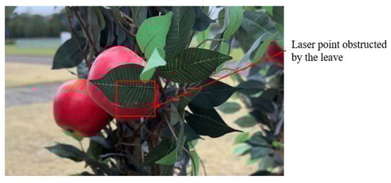 There were some occasions when the laser range finder was unable to reach the apples accurately. As indicated in Figure 11, the laser beam was obstructed by the leaves; to avoid this kind of error, the vision system should have been capable of analyzing the same target at different angles or obtaining several depth values in the detected area to identify the occlusions and analyze the variations.