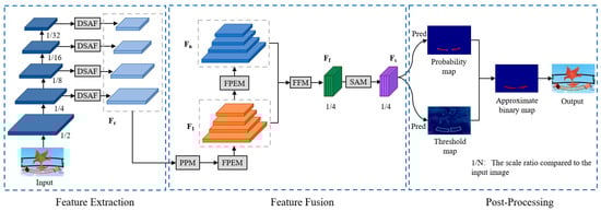 After feature extraction and fusion, post-processing operations are required to transform the obtained features. The segmentation network generates a probability map, and, subsequently, this probability map needs to be converted into a binary map. In this paper, we employ a differentiable binarization approach to address this issue. The basic formula for differentiable binarization is as follows: