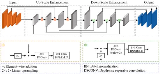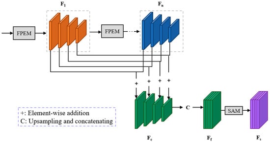 PFEM consists of PPM and FPEM. The FPEM exhibits a “U”-shaped structure with two components: up-scale enhancement and down-scale enhancement. The up-scale enhancement operates on the input feature pyramid, iteratively enhancing the feature maps to fully integrate shallow and deep features. The input for the down-scale enhancement is the feature pyramid generated by the up-scale enhancement. The down-scale enhancement generates output features through consecutive scaling and element-wise addition, and the resulting feature pyramid serves as the final output of the FPEM. The network structure of the FPEM is illustrated in Figure 5.