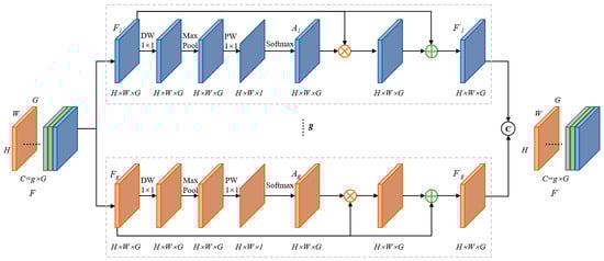 In the above formula, represents max pooling, stands for depthwise convolution with a kernel size of 1 × 1, and stands for pointwise convolution with a kernel size of 1 × 1. The attention feature map captures the non-linear dependencies between feature maps by learning cross-channel information. After the feature mapping process, each group of feature maps yields a set of feature maps , and its formula is as follows: