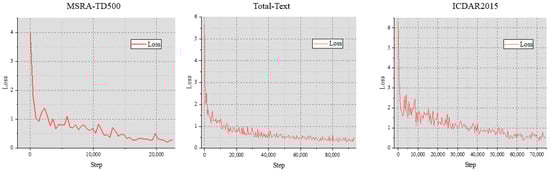 In this study, we selected Python 3.7 as the programming language and used the deep learning framework Pytorch 1.5 to conduct experiments. The entire experimental process was accelerated with the NVIDIA GeForce RTX 3090 graphics card. Initially, we trained the network using the SynthText synthetic dataset [41] for 100 k iterations and then fine-tuned the model for 1200 epochs on real datasets based on the pre-trained model. We strictly adhere to the officially provided dataset without any modification, ensuring the accuracy of our experiments. In our experimental settings, we set the initial learning rate to 0.007, to 0.9, weight decay to 0.0001, the number of cascaded fpems to 2, momentum to 0.9, and batch size to 16. Adam [42] was adopted as our training optimizer. The learning rate was continuously reduced using the following formula: