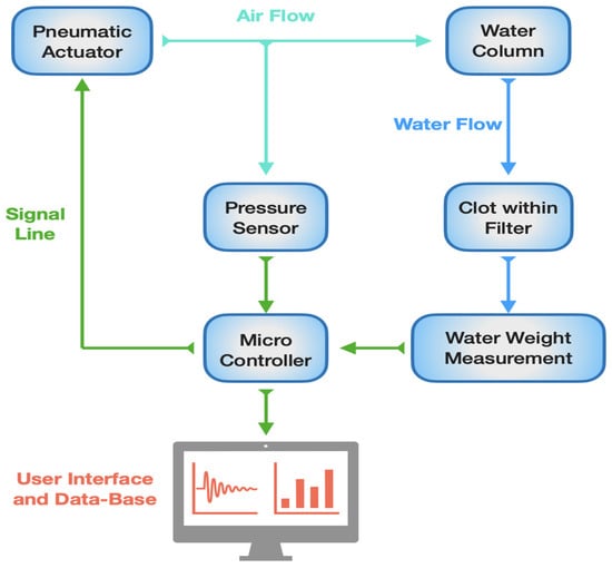 Block diagram of clot permeability measurement system. Green lines represent the signal line and the communication between the different subsystems. Light-blue lines represent the airflow from the pneumatic actuator (a pump in this case). Blue lines represent the water flow from the water column.