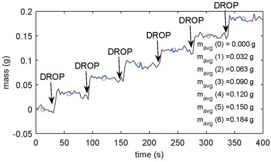 Figure 3 shows the mass measurement in a test where six droplets were consequently added to the disposable micro-cup; the mass increments are distinguishable from the noise floor, confirming the estimated resolution.