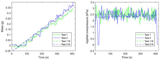 The support filters were tested using the measurement protocol above described with different applied pressures: about 2.5 kPa for the filters with a 0.45 µm mesh and 3 kPa for those with a 0.22 µm mesh; 10 different samples of each filter type were tested. To obtain the permeability measurement, a linear fitting of mass data over time was used since, as previously described, the liquid flow is not constant, as shown in Figure 4, depicting two typical liquid discharge trends over time using 0.22 µm mesh filters. The linear regression considers data from the instant in which the first drop fell to the instant in which the last drop fell.