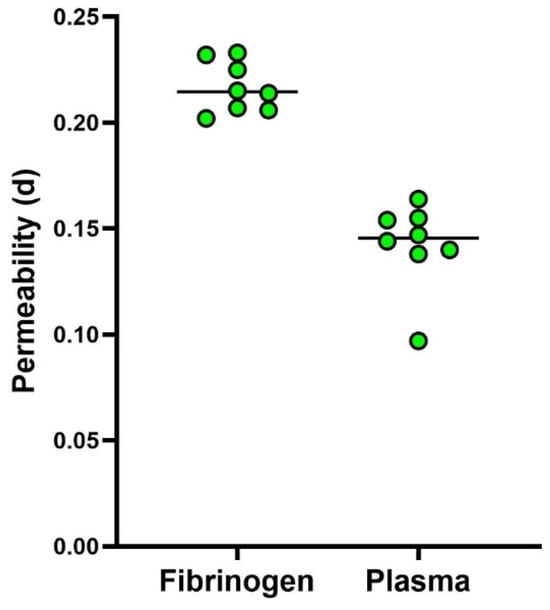 Finally, to characterize clot reproducibility in a single healthy subject, eight fibrinogen clots and eight plasma clots were prepared and assayed with 0.22 µm filters. For plasma clots, the median permeability value resulted in 0.1455 (range 0.0970–0.0670) d, and for the fibrinogen clots resulted in 0.2145 (range 0.2020–0.2330) d. The results of these experiments are shown in Figure 5, where the black line represents the median value.