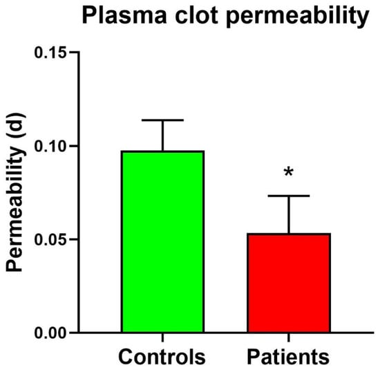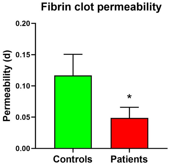 Fibrinogen clot permeability in patients and controls. * Significant difference vs. controls at the p < 0.05 level.
