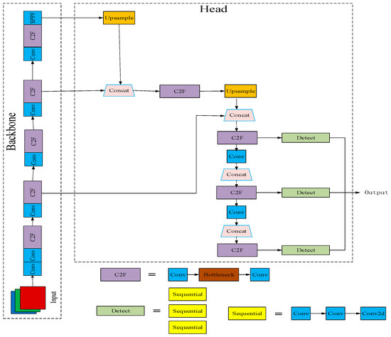 The Yolo algorithm partitions the image into multiple grids, predicts the bounding boxes within each grid along with the classes of objects they contain, and resolves any overlapping bounding boxes using a non-maximum suppression (NMS) algorithm. As a quintessential single-stage detection algorithm, Yolo has evolved into Yolov8, the latest iteration in the Yolo lineage, introduced in 2023 by Ultralytics [21]. Noteworthy among its features is its robust scalability. Serving as a framework, Yolov8 facilitates seamless compatibility with preceding Yolo versions, enabling straightforward comparison of their performance [22]. The network structure of Yolov8n is depicted in Figure 1.