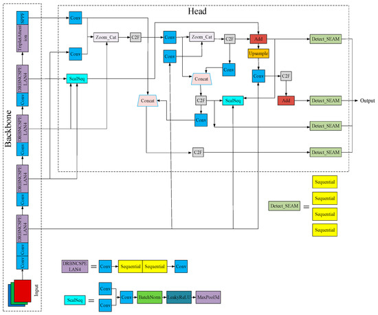 Enhancing the Yolov8n model by integrating the Dilated Reparam Block from UniRepLKNet and subsequently introducing RepNCSPELAN into Yolov9 to replace the C2f module for the backbone network leads to improvements in the convergence rate and a reduction in the parameters and computations without sacrificing accuracy. Modifications to the HEAD component involve employing attention-scale sequence fusion and introducing a P2 detection layer to refine the network structure. SEAMHead incorporates occlusion-aware Attention to enhance performance and adeptly handle occlusion scenarios. The Focaler IoU series replaces the original loss function to expedite convergence and yield more precise regression results. Additionally, Triplet Attention is integrated to enhance the feature fusion capacity of the network. The refined network structure is depicted in Figure 2.