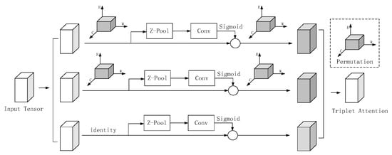 Diganta Misra [28] introduced a nearly parameter-free attention mechanism to delineate channel and spatial attention, which is termed Triplet Attention (Figure 6). Triplet Attention comprises three parallel branches, two of which capture cross-dimensional interactions involving channel C and space H or W. The final branch, akin to CBAM, constructs Spatial Attention. These outputs from the last three branches are aggregated through averaging.