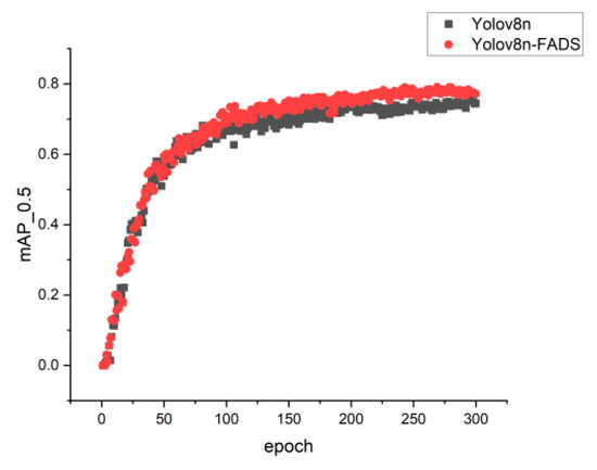 Figure 7 depicts the training accuracy curves of both the Yolov8n and Yolov8n-FADS models. It is evident that during the initial training phase, the accuracy levels of the original model and the enhanced algorithm are comparable. However, beyond approximately 80 training iterations, the accuracy curve of the enhanced algorithm exhibits a steeper incline compared to that of the original algorithm. Consequently, the final accuracy attained by Yolov8n-FADS significantly surpasses that of the original algorithm.