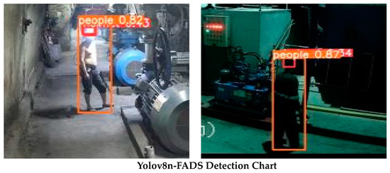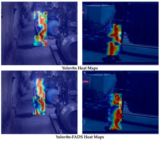 In order to further explore the improvement effect of Yolov8n-FADS, Yolov8n was selected. The Yolov8n-FADS method produces heat maps of the detected regions, where the lighter-colored parts indicate the lower confidence regions in the feature maps and the darker-colored parts are the higher regions. The results are presented in Figure 9. The Yolov8n-FADS algorithm focuses on feature regions that cover a wider area than those identified by Yolov8n, and it pays more attention to these regions. It is observed that the algorithm pays greater attention to the part of the head that is occluded by light, which addresses the issue of missed detection. It can be observed that the heat map of the enhanced algorithm encompasses a larger area and exhibits a more extensive distribution, which suggests the enhanced detection of the miner’s helmet.