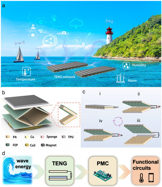The ocean, covering 71% of the Earth’s surface, harbors abundant renewable resources essential for human survival [1,2]. However, the dynamic environment and complex climate of the ocean present significant safety hazards, so monitoring of the marine environment is of paramount importance [3,4,5]. Real-time monitoring and data collection in the marine environment are facilitated by self-powered marine sensors, which have become indispensable tools [6,7,8,9]. This provides important information support for our ocean protection and management. Currently, sensor power in the ocean is primarily dependent on batteries. However, the environmental pollution and ecosystem disruption caused by battery usage, as well as the significant investment in human and material resources for battery maintenance, increase the cost and complexity of ocean monitoring [10,11,12,13,14]. Therefore, there is an urgent requirement for a clean, efficient, and cost-effective energy harvesting method to power sensors in the ocean.