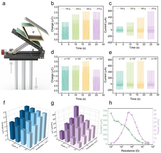 The output performance of the TENG under different parameters: (a) schematic diagram of the motor and tilt angle platform; the effect of the counterweight change on (b) output transferred charge and (c) output short-circuit current; the effect of the elastic skeletal angle α change on (d) output transferred charge and (e) output short-circuit current; the effect of acceleration and tilt angle θ on the (f) output transferred charge and (g) output short-circuit current; (h) the output current and power-resistance change curve of the TENG.