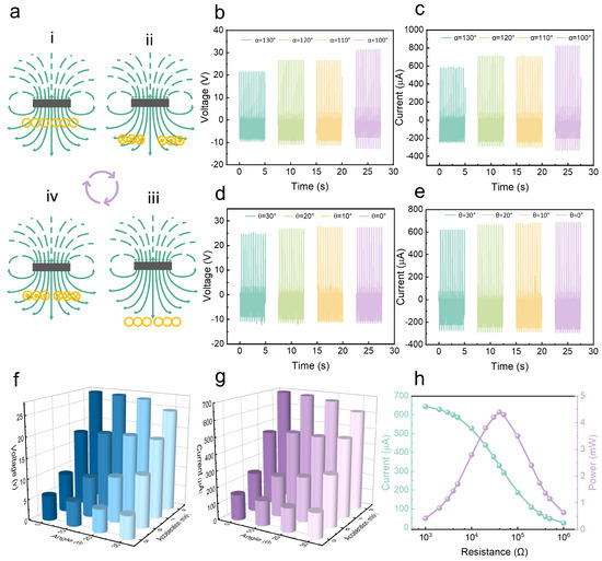 The output performance of the EMG under different parameters: (a) schematic diagram of the working principle of the EMG; the effect of the elastic skeletal angle α change on (b) output open-circuit voltage and (c) output short-circuit current; the effect of the tilt angle θ change on EMG (d) output open-circuit voltage and (e) output short-circuit current; the effect of acceleration and tilt angle θ on the (f) output open-circuit voltage and (g) output short-circuit current; (h) the output current and power-resistance change curve of the EMG.