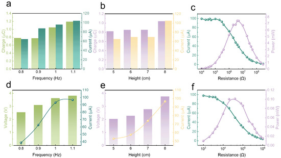 The output performance of ES-HNG under water wave conditions: the output transferred charge and short-circuit current of the TENG under different (a) water wave frequencies and (b) water wave heights; (c) the output short-circuit current and power-resistance change curve of the TENG under water wave conditions. The output open-circuit voltage and short-circuit current of the EMG under different (d) water wave frequencies and (e) water wave heights; (f) the output current and power-resistance change curve of the EMG under water wave conditions.