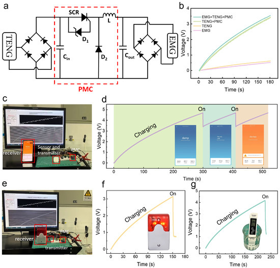 Application demonstration of the ES-HNG: (a) schematic diagram of the PMC principle. (b) The charging curve of a 1 mF capacitor under actual water wave conditions; (c) demonstration diagram of the ES-HNG powering the self-powered meteorological monitoring system; (d) voltage charging curve of the self-powered meteorological monitoring system; (e) demonstration diagram of the ES-HNG powering the self-powered emergency alarm system; (f) voltage charging curve of the self-powered alarm system; (g) voltage charging curve of the ES-HNG powering the water quality monitoring pen.