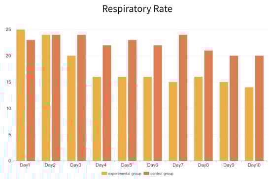 Figure 8, it can be observed that the average respiratory rate detected on the first day was 25 for the experimental group and 23 for the control group, with little difference between the two groups. Because both groups of subjects were undergoing radiation therapy for the first time, the data detected on the first day were generally more tense. Under normal circumstances, the normal respiratory rate for adults typically ranged from 12 to 20 breaths per minute, and it can be seen that both groups of subjects exceeded this normal range after averaging due to stress and pressure.
