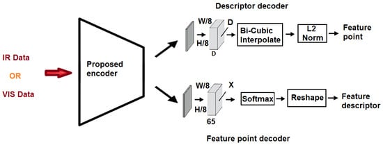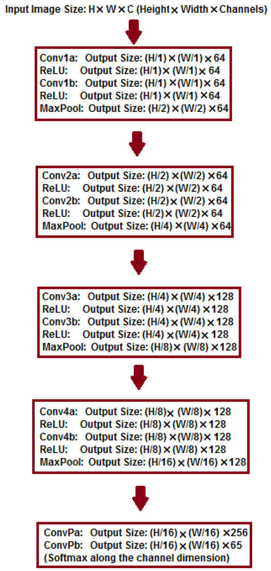 Figure 2 illustrates the proposed feature detection and description method, inspired by [], which employs an auto-encoder to enhance the efficiency of feature point detection and description. Auto-encoders consist of two primary components: the encoder and decoder [,]. A VGG-like [] convolutional neural network is designed and implemented as the shared encoder. Figure 3 shows the fully convolutional neural network with all the details as the shared encoder. We mitigate inaccurate feature detection by exploiting the inherent dimensionality reduction advantage of encoders.