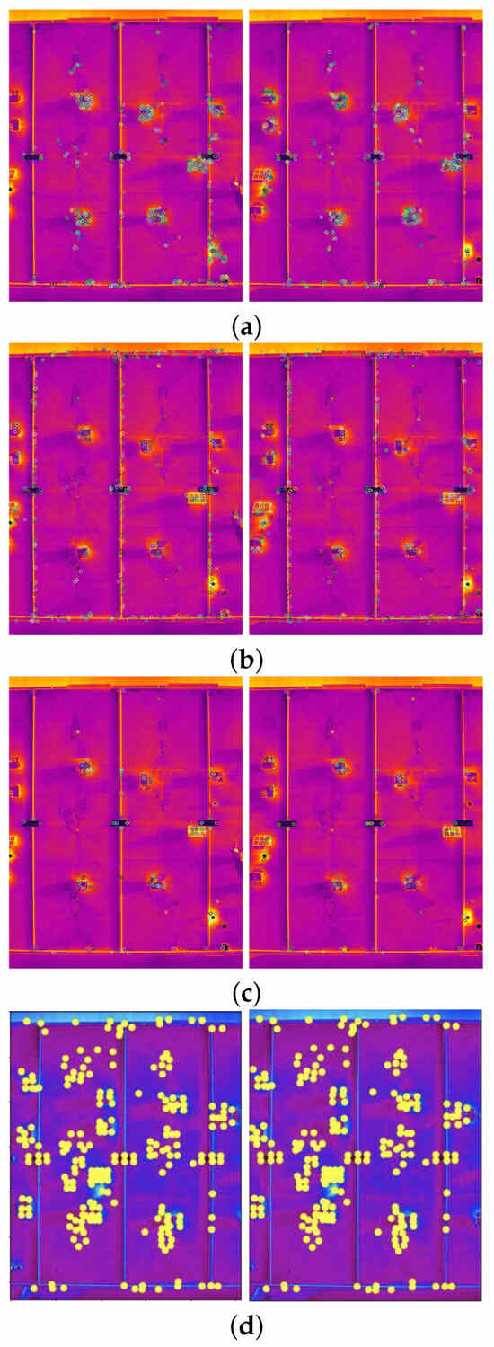 This study uses two datasets containing coupled thermal and visible images of industrial assets to evaluate the proposed approach. The first dataset is related to a wall of concrete. A Zenmuse H20T camera (Da-Jiang Innovations Science and Technology Co., Ltd., Shenzhen, China) collected coupled thermal and visible images with resolution. This dataset contains 86 coupled IR and thermal images. The other dataset is related to the roof of a building. This dataset includes 73 coupled thermal and visible images. A DJI M300 drone (Da-Jiang Innovations Science and Technology Co., Ltd., Shenzhen, China) equipped with a Zenmuse H20T camera was employed for acquiring thermal and visible images. The images of both datasets have almost 75% overlap. Both dataset are captured at an altitude of 15 m. All the experiments in this paper were implemented in Python programming language on a computer with a 2080Ti GPU.