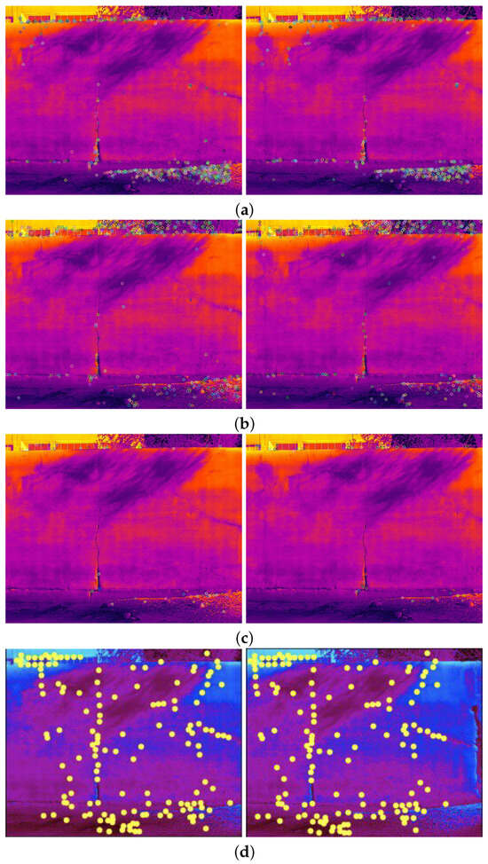 Feature detector performance results on infrared image dataset 2 for two consecutive images. (a) ORB features, (b) SIFT features, (c) AKAZE features, (d) the proposed method feature points. Challenges and complexities: repetitive patterns on the surface, homogeneity, and lack of texture.
