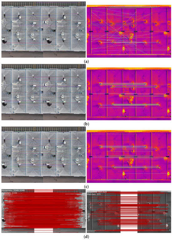 In Figure 4, we present a visual representation of two successive images in each row exhibiting a 0.75 overlap. In the case illustrated in Figure 4a, we focus on visible images characterized by repetitive patterns and homogeneity. The ORB feature detector is employed in this scenario, with its primary strength lying in the identification of points along edges. However, it is noteworthy that the number of points identified by ORB is somewhat constrained. Moreover, we anticipate the need for more repetition of feature points in areas where the two sequence images overlap.