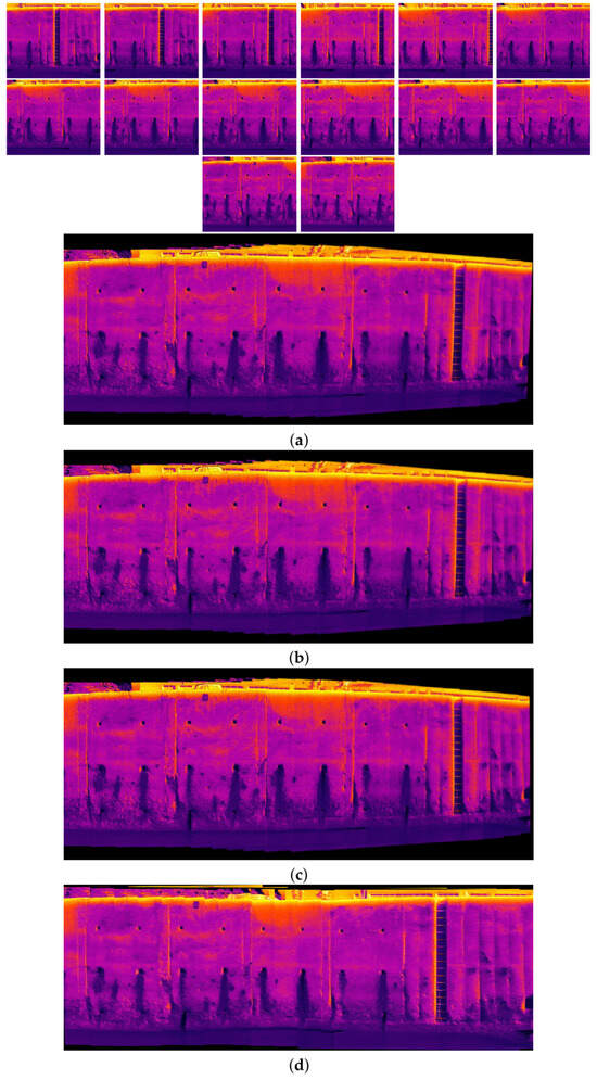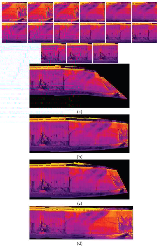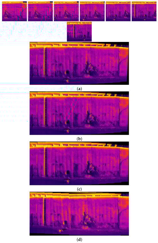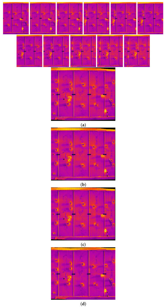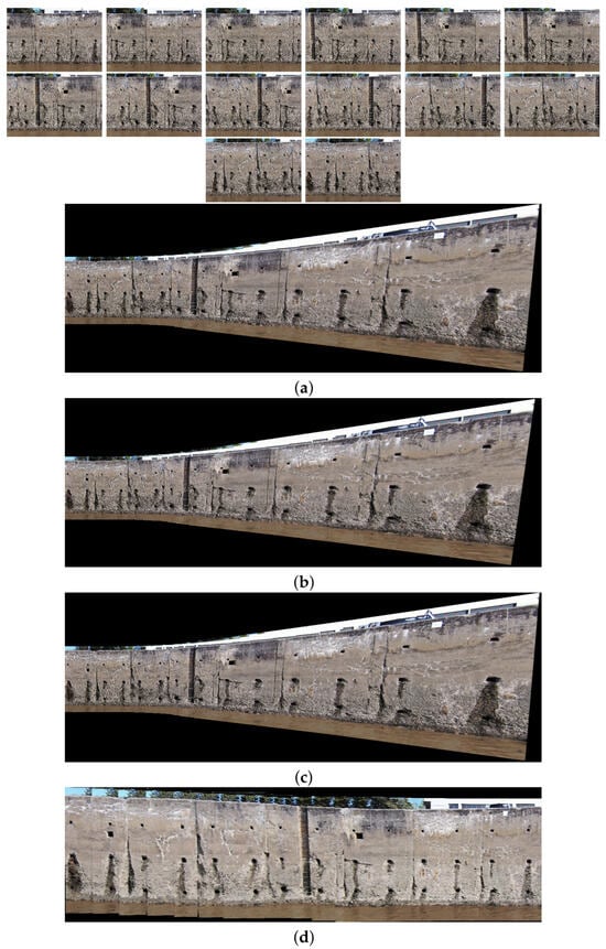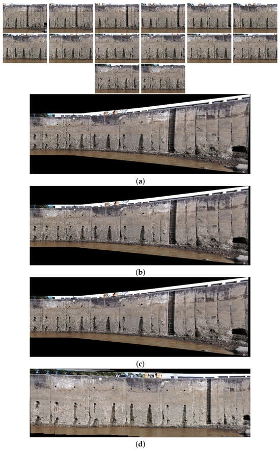 Image stitching combines multiple images with overlapping areas to create a larger panoramic image []. Image stitching plays an important role in enhancing the effectiveness of infrastructure inspection. Infrastructures span vast areas, and conventional imaging techniques may not capture the complete picture, especially for defects requiring more visual coverage []. Image stitching techniques offer a solution by seamlessly combining image sequences captured from different perspectives into a single, comprehensive representation.