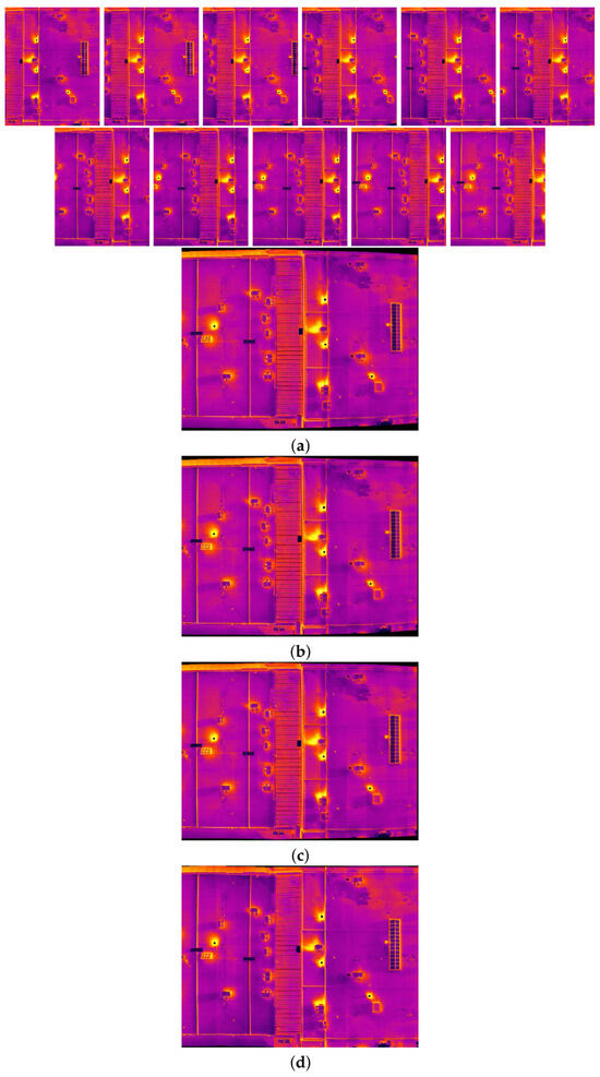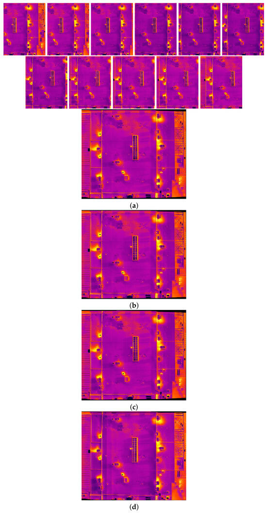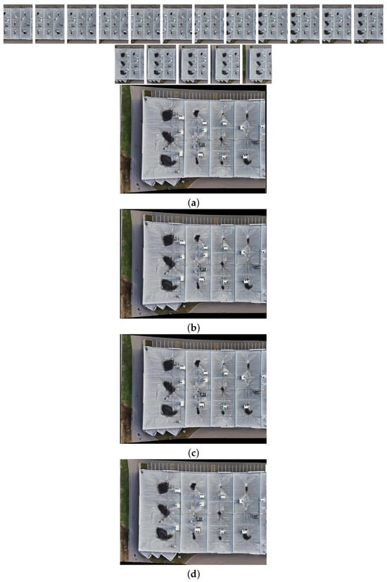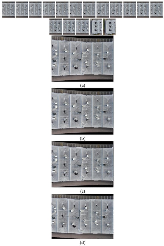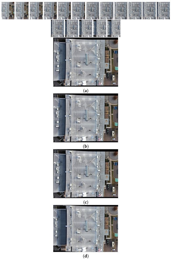 Image stitching for fourteen visible images of dataset 2. (a) AKAZE + BFMatcher: the stitched image has a high perspective distortion; (b) ORB + BFMatcher: the stitched image has a high perspective distortion; (c) SIFT + BFMatcher: the stitched image has a high perspective distortion; (d) proposed method: the stitch image is regular and perspective distortion free.