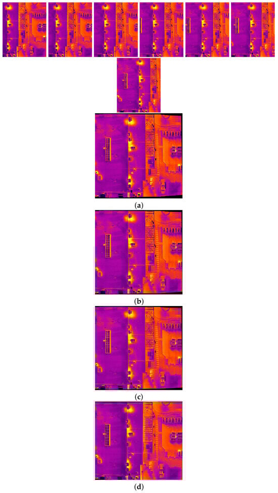 Image stitching for eight visible images of dataset 2. (a) AKAZE + BFMatcher: the stitched image has a high perspective distortion; (b) ORB + BFMatcher: the stitched image has less perspective distortion and shape deformation; (c) SIFT + BFMatcher: the stitched image has a high perspective distortion; (d) proposed method: the stitch image is regular and perspective distortion free.