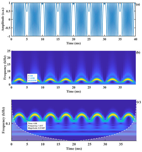 Figure 2a shows the SMI signal corresponding to a displacement with an amplitude of 2 µm and a frequency of 100 Hz. By performing CWT on this signal, we construct Figure 2b. To observe the frequency values in the low-frequency region more clearly, the vertical axis is transformed to a logarithmic scale, resulting in Figure 2c. From Figure 2c, it is evident that in the time–frequency spectrum, the signal with a frequency below 1.4 kHz becomes blurred, causing the main frequency in the low-frequency region to be overwhelmed. When the instantaneous velocity of the motion is relatively slow, the main frequency of the generated Doppler signal becomes very small. This low-frequency signal becomes challenging to detect in the time–frequency spectrum obtained through CWT, ultimately failing to detect the velocity of the object. To address the frequency resolution issue of CWT in the low-frequency region, we employ a high-frequency sinusoidal carrier signal to multiply the SMI signal, resulting in an amplitude-modulated SMI (AM-SMI) signal, as shown in Figure 3a. This operation shifts the spectrum of the SMI signal to the carrier frequency region, as shown in Figure 3b, where the carrier frequency is 6 kHz. It can be observed that in the time–frequency spectrum, the signal energy above the carrier frequency leaks toward higher frequencies, causing the signal energy to be dispersed [36], which is not conducive to the extraction of the main frequency ridge. To suppress the spectral leakage problem of CWT and enhance the spectral resolution, SSWT is introduced to compress the frequency values within the time–frequency grid of the signal, which makes the frequency values of the signal more concentrated and improves the frequency resolution at the same time.