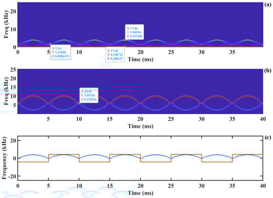 In the time–frequency diagram , the frequency with the largest energy is called the time–frequency ridge, which is expressed through Equation (14) and shown in the red line of Figure 4b as follows: