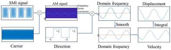 To address this shortcoming of the CWT in SMI signal extraction and to achieve more accurate displacement reconstruction, this paper innovatively proposes an amplitude modulation integration reconstruction method (AM-IRM). Specifically, a high-frequency sinusoidal carrier is algebraically multiplied with the SMI signal to shift its frequency to that of the high-frequency carrier. The synchrosqueezing wavelet transform is then applied for the time–frequency transformation, allowing for the precise extraction of the complete Doppler frequency of the signal. The target displacement is reconstructed using the Doppler velocity integration reconstruction method. This paper is divided into the following sections: (1) An introduction to the principle of the AM-IRM; (2) A simulation analysis of the impact of different carrier frequencies, time-varying C values, and high levels of noise interference on reconstruction accuracy; and (3) The verification of the algorithm’s feasibility through experiments involving harmonic motion and non-cooperative target vibration reconstruction.
