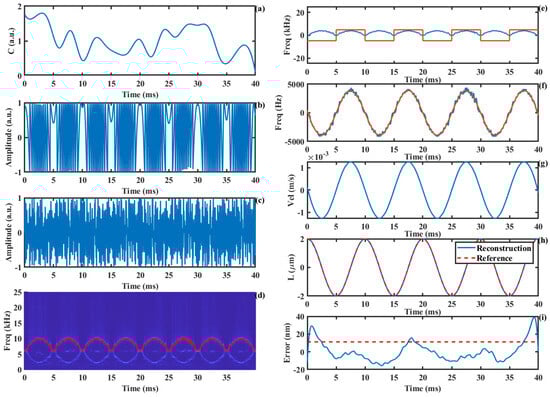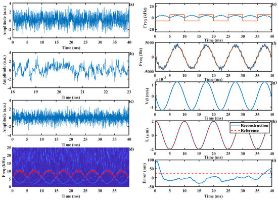 The proposed method not only effectively resists the influence of time-varying C values but also exhibits strong noise immunity. Even under 0 dB SNR conditions, the algorithm maintains a high displacement reconstruction accuracy, as shown in Figure 9. Figure 9a presents the SMI signal with an SNR of 0 dB, while Figure 9b shows a locally magnified portion of the signal, revealing that the signal details are almost lost at this point. Figure 9c illustrates the AM-SMI signal. As shown in Figure 9d, even under strong noise interference, the time–frequency ridge of the signal can still be effectively extracted. The displacement reconstruction process based on the time–frequency ridge is the same as described earlier. The reconstruction error curve is shown in Figure 9i, with an RMS error of 22.2 nm.
