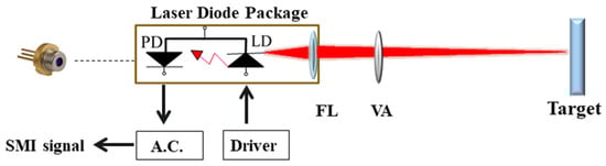 - Alexandrova, A.S.; Tzoganis, V.; Welsch, C.P. Laser diode self-mixing interferometry for velocity measurements. Opt. Eng. 2015, 54, 034104. [Google Scholar] [CrossRef]