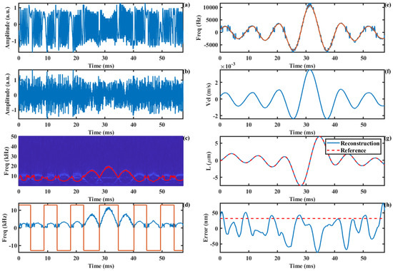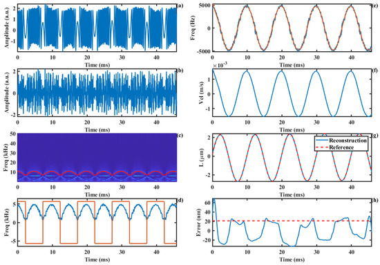 The experimentally acquired SMI signal is shown in Figure 11a. We set the carrier frequency to 6 kHz, and the corresponding AM-SMI signal is shown in Figure 11b. At this carrier frequency, the maximum value of the signal is approximately equal to the carrier frequency, resulting in a relatively clear time–frequency ridge. The extracted time–frequency ridge and direction information are presented in Figure 11d. The true Doppler frequency curve that was recovered based on the direction information is shown by the blue line in Figure 11e, while the smoothed curve is represented by the red line. The motion velocity curve of the loudspeaker, obtained by the Doppler frequency shift formula, is illustrated in Figure 11f. Furthermore, the displacement curve obtained through velocity integration is shown by the blue line in Figure 11g, with the red line indicating the reference displacement. Compared to the reference displacement, the measurement error of our proposed method is presented in Figure 11h, with an RMS measurement error of 21.1 nm.