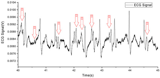However, it remains challenging to remove the disturbance of MAs from an ECG signal. Due to the overlap of MAs and the components of the ECG signal in frequency [6], as shown in Figure 1 (MAs are marked with red arrows) and Table 1, traditional filtering methods are difficult to effectively remove MAs.