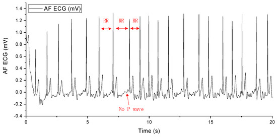 The occurrence of AF arises from abnormal electrical impulses suddenly originating from the atria. These impulses disrupt the normal rhythm of the heart and overshadow its natural pacemaker activity. AF causes irregular and abnormally rapid contractions of myocardial cells, leading to alterations in the heart’s rhythm and resulting in an irregular heartbeat, palpitations, dizziness, shortness of breath, and fatigue. Diagnosis of AF from an ECG primarily involves observing the following three characteristics in the electrocardiographic signal: unequal RR intervals, the disappearance of the P wave, and the appearance of the F wave, as shown in Figure 2. When these three features are present in the ECG, a diagnosis of AF can be made [50].